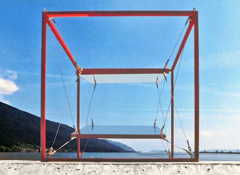 1980, sculpture, suspended mirrors, 200 x 200 cm x 300 cm, mirror, aliuminium profile, iron wire