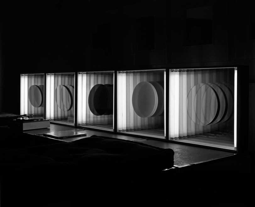1973-74, light kinetic: turning ellipses in an endless room, each 72 x 68 x 12 cm wood, mirror, transparent mirror, light tubes, motor