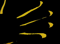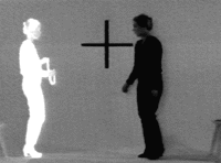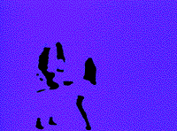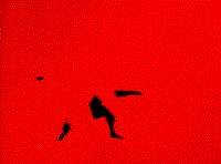 Eine Bewegungs-Interaktion zwischen drei Tänzerinnen: Zwei Tänzerinnen integrieren sich durch ihre farbliche Angleichung an den Hintergrund in den Bildraum, so daß sie nur im Kontext zu der dritten Tänzerin für den Betrachter wahrnehmbar werden. Durch die Überlagerung verschwindet zugleich die schwarze Figur oder es bleiben nur noch einzelne Teile von ihr übrig - ähnlich einer akustischen Situation beim Abstimmen von Musikinstrumenten.