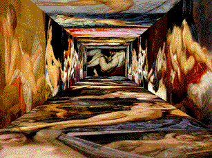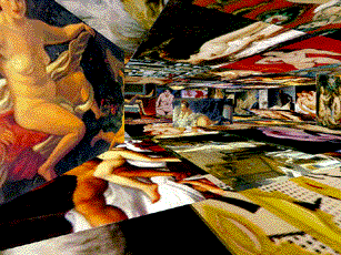 INHALT DER ANIMATION: Eine Anthologie von ca 200 liegenden, sitzenden und stehenden weiblichen Akten aus der Malerei der letzten 500 Jahre - von der Renaissance ausgehend bis in die zeitgenössische Kunst reichend - bildet die Grundstruktur der Animation. Alle Akte - meistens Ausschnitte aus Bildern - sind im Computer auf ungefähr dieselbe Körpergröße skaliert worden. (Der größte Teil der uns bekannten weiblichen Akte sind von Männer gemalt: um nur einige zu nennen Cranach ,Tizian, Tinoretto, Botticelli, Jordaens, Rembrandt, Rubens, Boucher, Courbet, Poussin, Ingres, Delacroix, Matisse, Kirchner, Picasso, Grosz, Modigliani, Balthus, Lichtenstein etc. ). Alle zusammen bilden sie eine flexible Architektur bestehend aus langen Korridoren, Verzweigungen, Sackgassen, großen Hallen, Treppen. Ein riesiges Labyrinth - vollständig austapeziert mit den vielen sich im Raum verschiebenden und drehenden Frauenakten - in welchem ein Mann sich verlustiert, Ängste aussteht, flüchtet, tanzt, kommuniziert und und und... Dieser Mann ist ausschließlich in Form seines Blickes erkennbar und präsent. Es ist der parodierte öffentliche und private, historisch geprägte 'doppelte' Blick des europäischen Mannes inklusive seiner Fantasien, Wünsche und Ängste. Die Animation ist dramaturgisch so konzipiert, daß sie einen Anfang, einen Mittelteil und ein Ende hat. Der Anfang ist die Begegnung mit der ersten Frau - der Venus von Tizian - einer Figur, die Mutter und Geliebte gleichzeitig sein kann; sie bereitet ihm den Weg zum labyrinthischen Chaos der alten und jüngeren europäischen "Frauenwelt", in der er genüßlich umherschweift, sich verirrt, gehetzt wird, außer Atem kommt, im Rausch sich zu verlieren scheint, um zum Ende, sich von der letzten Frau - einer Nana (einer der wenigen von einer Frau geschaffenen weiblichen Akte) - verabschieden zu lassen. Da in 4 Minuten die 200 verschiedene Akte weder von ihrer Anzahl noch von ihrer Geschwindigkeit her, mit der sie vorbei huschen, wirklich wahrgenommen, geschweige denn wiedererkannt werden können, wirkt die Animation hoch komplex. Diese Komplexität gepaart mit Witz und Ironie, mit dem der männliche Blick herumschweift und die weiblichen Akte sich ihm in den Weg stellen und Verwirrung stiften, motiviert den Betrachter, die Projektion ein zweites oder gar ein drittes Mal zu sehen.